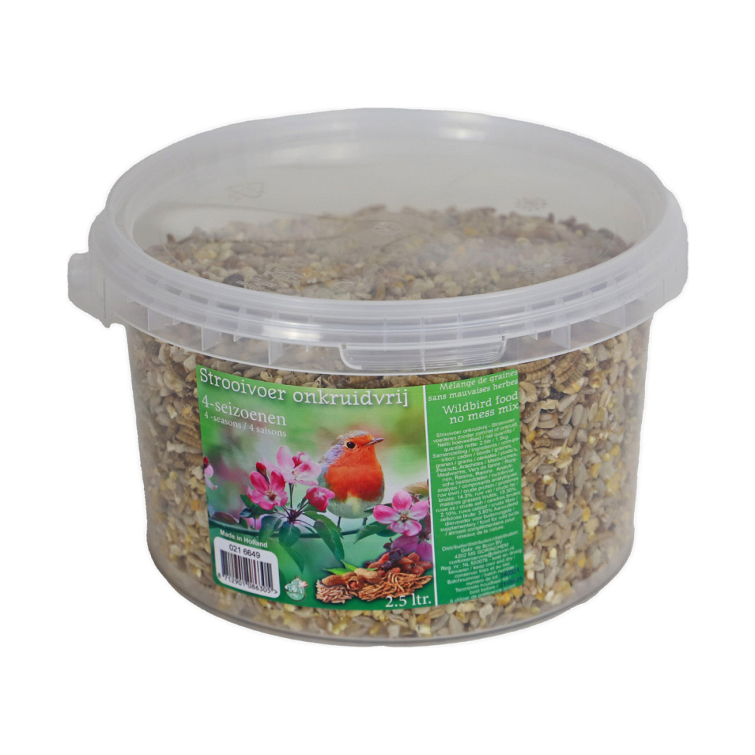 Verwen de vogels in je tuin zonder je druk te maken over onkruid, met dit speciaal hiervoor ontwikkelde 4-Seizoenen Strooivoer Onkruidvrij. Dit speciale mengsel is vrij van zonnebloempitschillen waardoor je je geen zorgen hoeft te maken over de achtergebleven rommel, of opkomende zonnebloemen.