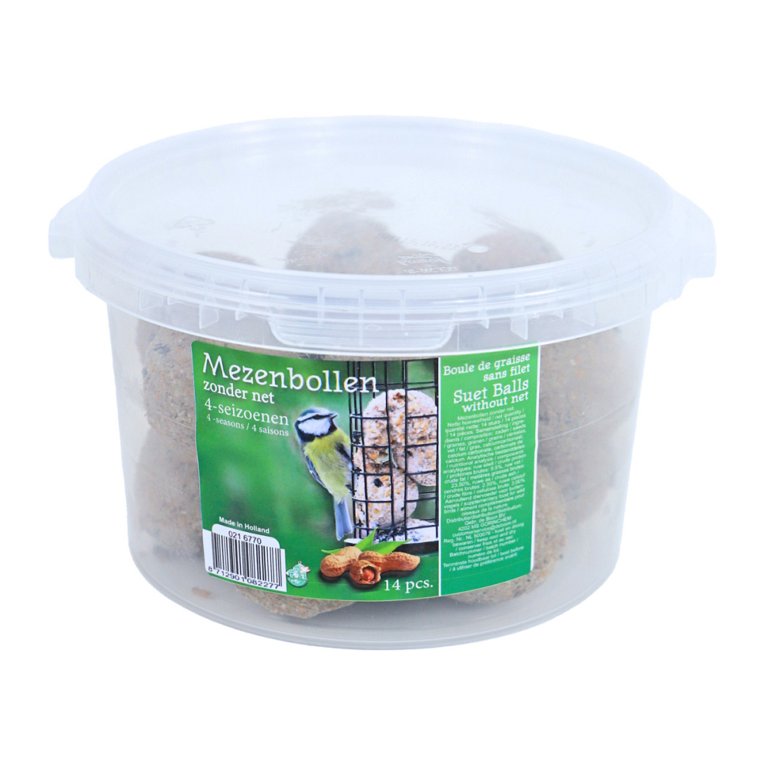 Mezenbollen zonder net voor het bijvoeren van de buitenvogels. Geschikt voor alle seizoenen.