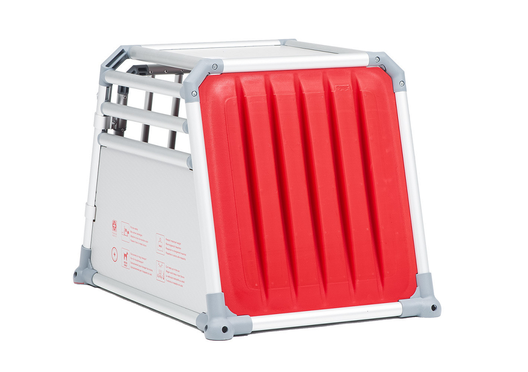 Stevige, aluminium transportbox met gemakkelijke toegang en een goede bescherming voor jouw hond. Voldoet aan TÜV richtlijnen. Afm. 54,4 x 54,4 x 73,5 cm.