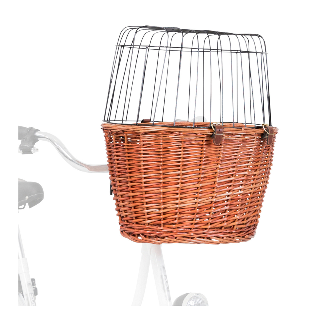 Mooie hondenfietsmand voor aan het stuur, van wilgenteen en met draadkoepel tegen uitspringen.