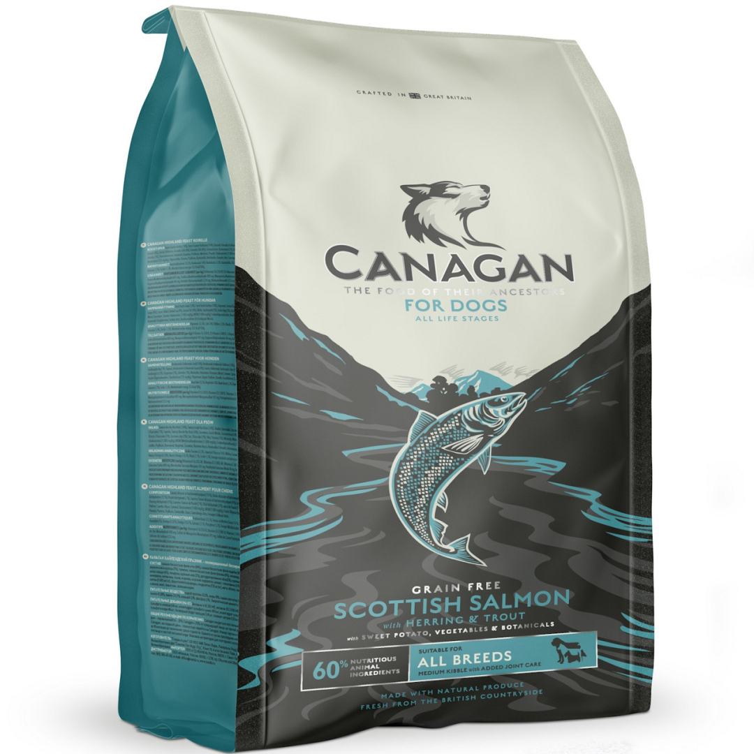 Graanvrij hondenvoer met versbereide Schotse zalm, met versterking van eiwitrijke haring, forel en witvis.