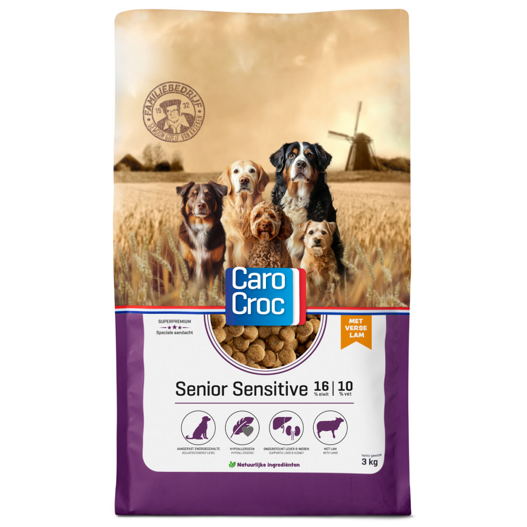 CaroCroc Senior Sensitive is speciaal afgestemd op de behoefte van oudere honden. Het ondersteunt de nier- en leverfunctie. CaroCroc Senior Sensitive bevat omega-3 en -6 vetzuren en 37% lam.