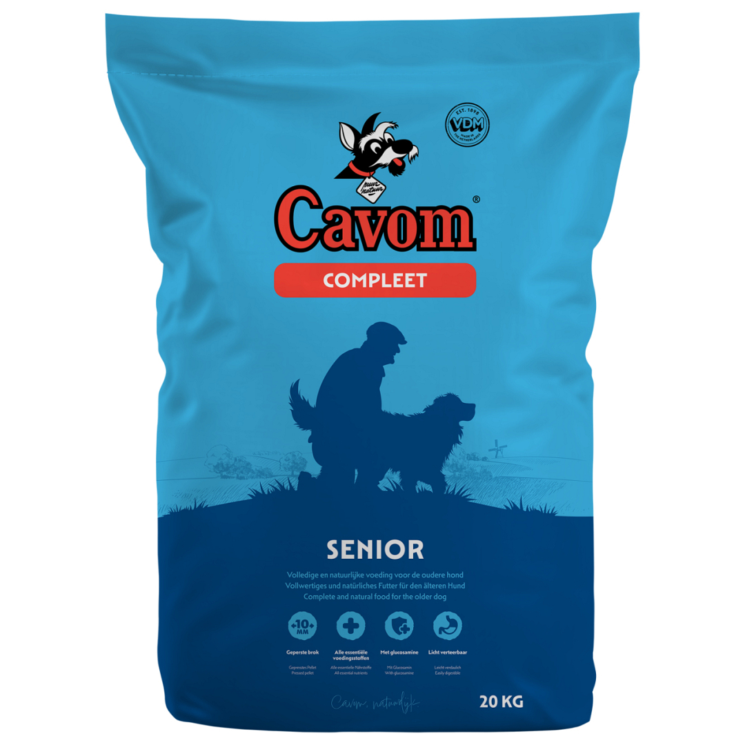 Cavom Compleet Senior is een volledige voeding voor de oudere hond. Het heeft een lager eiwitgehalte, bovendien zijn de eiwitten aangepast. De granen met o.a. mais, tarwe en rijst zijn praktisch geheel ontsloten.