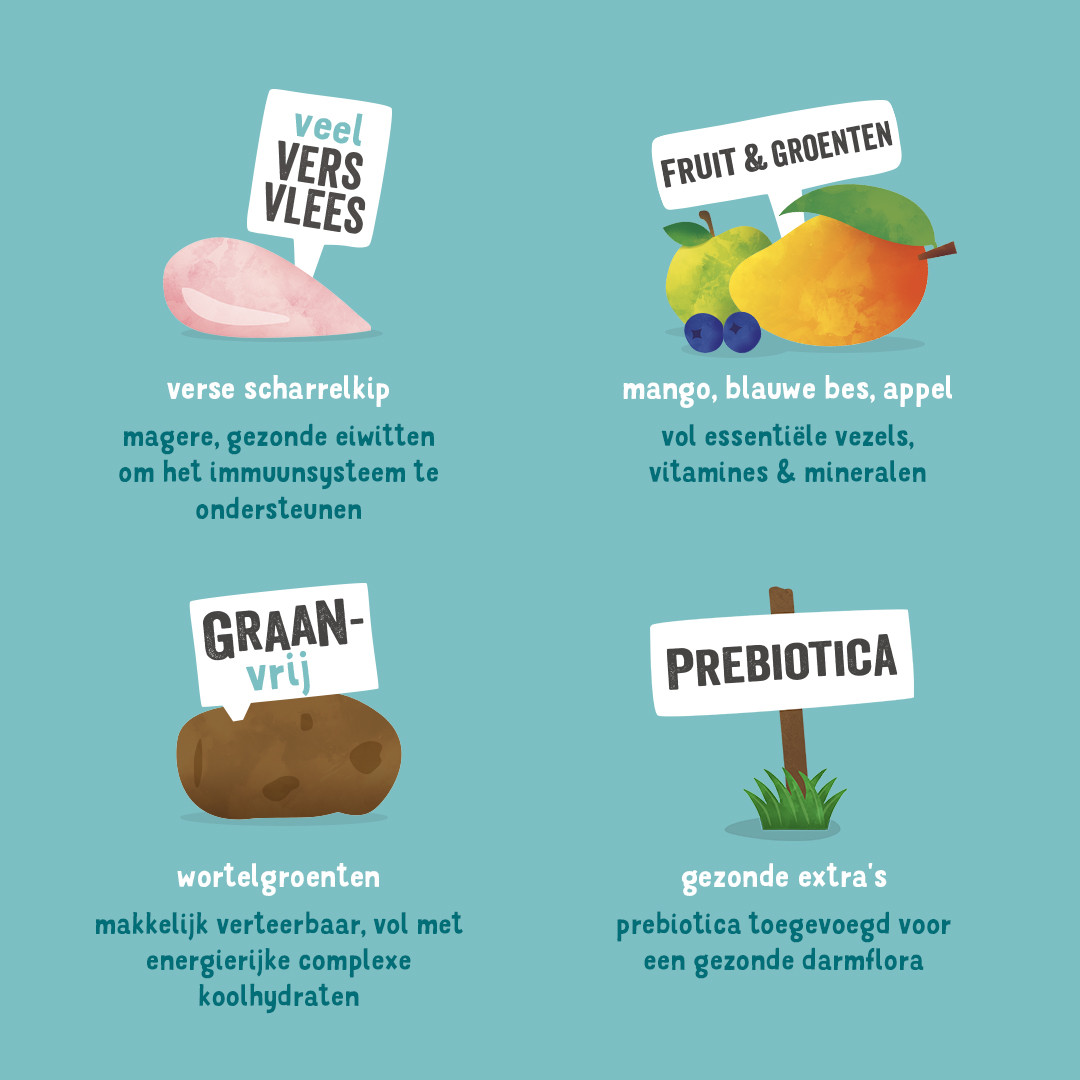 Samenstelling: verse kip 41%, aardappelen, erwten, erwteneiwit, kippenvet, lijnzaad, kippensaus, mineralen, visolie, mannan-oligosachariden (MOS), fructo-oligosachariden (FOS), mango 0,04%, bosbessen 0,04%, appels 0,04%, aardbeien 0,04%, wortels 0,04%, tomaten 0,04%, goudsbloemblaadjes, brandnetel, braambesblaadjes, venkel, karwij, kamille, melisse.