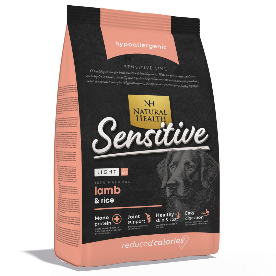 Natural Health Sensitive Reduced Lamb & Rice is een voeding met slechts één eiwitbron en daarmee uitermate geschikt als hypoallergeen voer of uitsluitdieet.