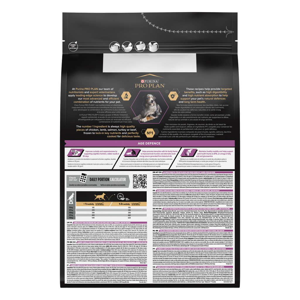 Pro Plan hondenvoer Medium & Large Adult 7+ is speciaal samengesteld voor alle honden van 7 jaar en ouder. Het bevat een mix van voedingsstoffen die bewezen heeft de alertheid, mentale kracht en hersenfunctie van ouder wordende honden te helpen verbeteren.