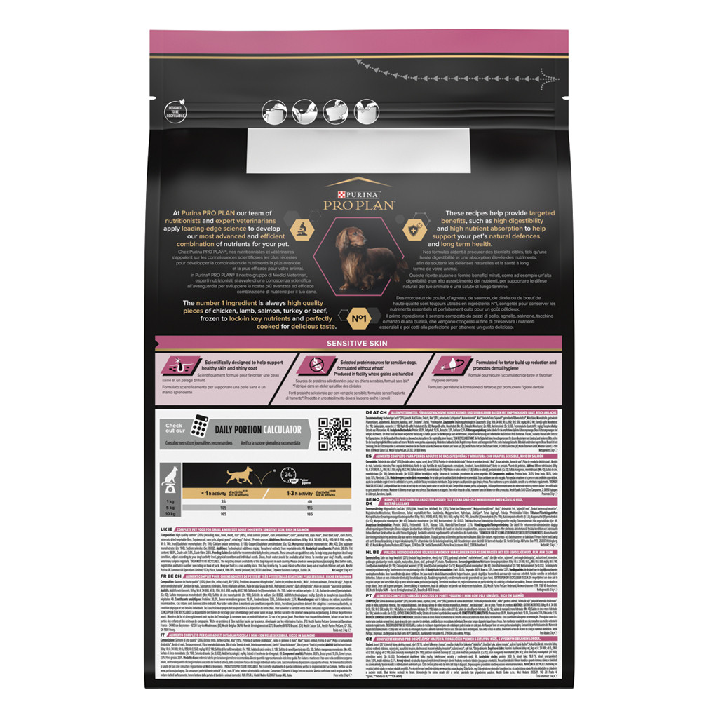 Pro Plan hondenvoer Small & Mini Adult Sensitive Skin met Optiderma bevat alle voedingsstoffen die een hond nodig heeft om in zijn behoefte te voorzien - plus voedingsstoffen voor het ondersteunen van een gezonde huid en glanzende vacht.