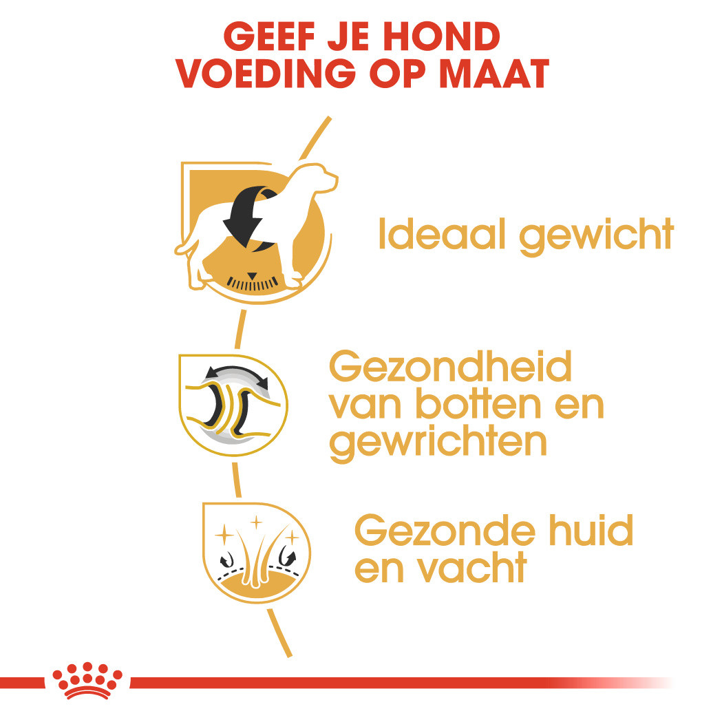 Rasspecifieke voeding speciaal afgestemd op de behoeften van de volwassen labrador retriever vanaf 15 maanden oud.