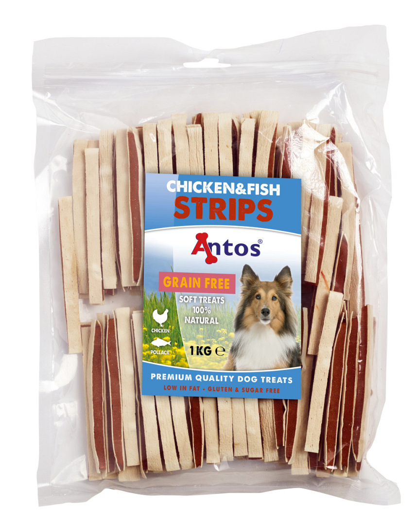 Antos Chicken & Fish strips zijn lekkere, zachte snacks voor de hond. Honden zijn dol op kip en vis! Een lekkere en gezonde traktatie met de 1 kg verpakte Chicken & Fish strips.
