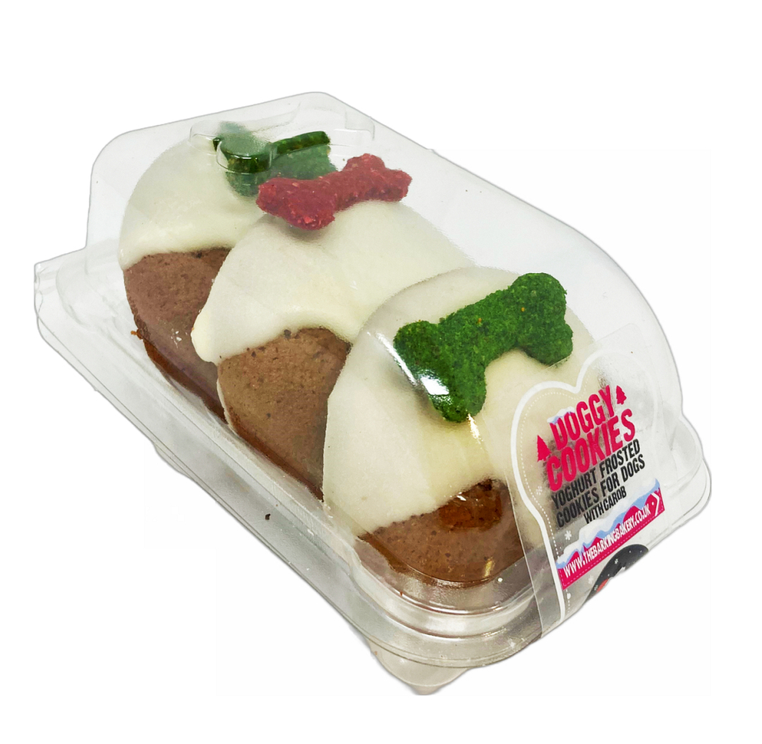 De Barking Bakery Yappy Woofmas Christmas Pudding Cookies worden liefdevol besprenkeld met yoghurtglazuur, compleet met een lekker groen bot en een plekje rood glazuur om het een feestelijk gevoel te geven.