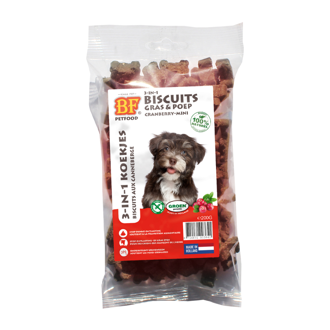 BF Petfood 3-in-1 Koekjes Cranberry Mini zijn gezonde en smaakvolle koekjes voor honden met (te) dunne ontlasting en/of die ontlasting* of gras eten of ter ondersteuning bij verandering van voer of niet goed verteerbaar voer. Ondersteunt de blaas, de urinewegen en het gebit. Daarnaast zijn de koekjes ook een lekker en gezond tussendoortje.