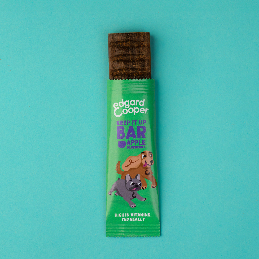 Keep It Up met de Edgard & Cooper reep met appel en bosbes, een natuurlijke oppepper boordevol vitamines voor honden van alle leeftijden. Deze graanvrije snack ondersteunt het welzijn van je huisdier en is de ideale energiebooster tijdens elk avontuur.