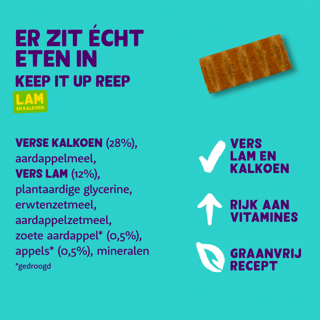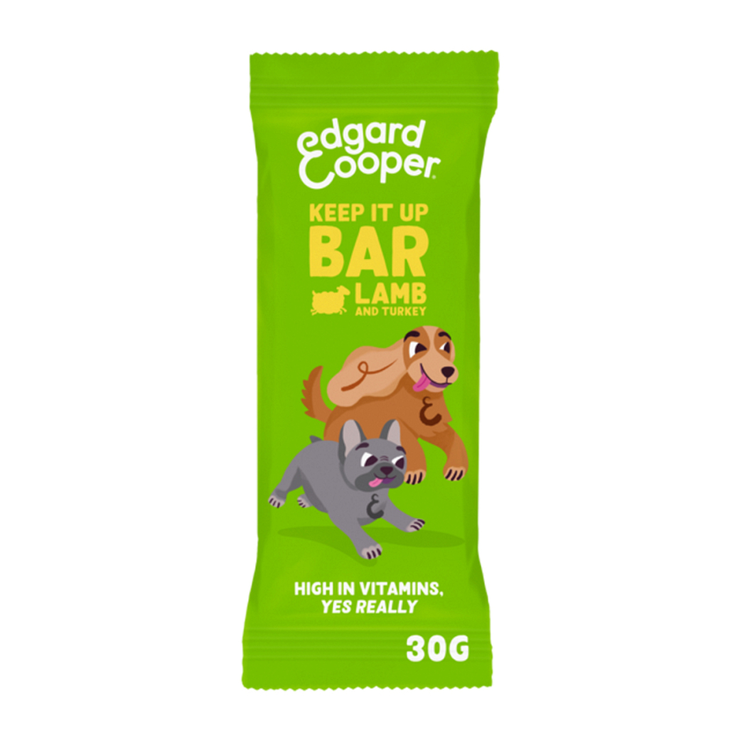 Keep It Up met de Edgard & Cooper reep met lam en kalkoen, een natuurlijke oppepper boordevol vitamines voor honden van alle leeftijden. Deze graanvrije snack ondersteunt het welzijn van je huisdier en is de ideale energiebooster tijdens elk avontuur.