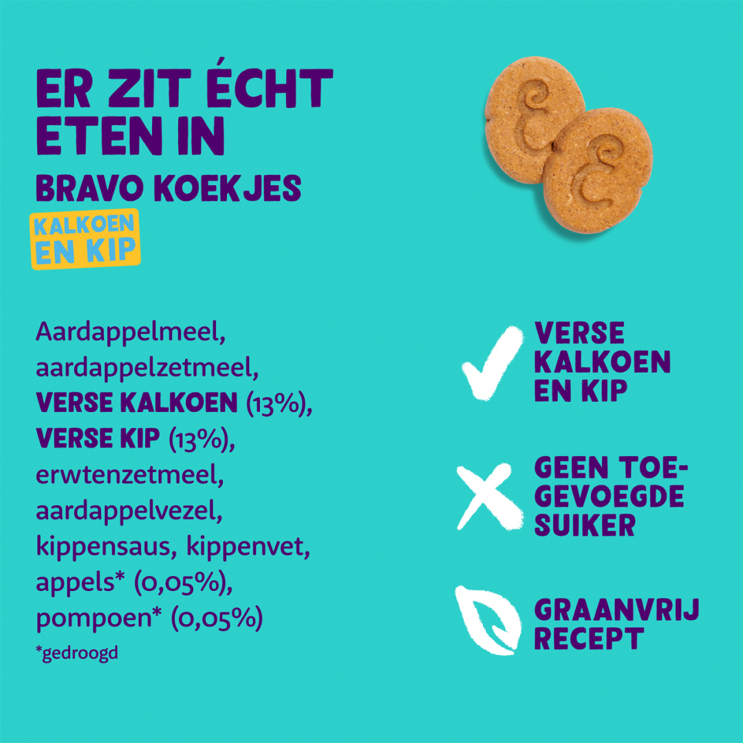Ingrediënten: verse kip 58%, verse kalkoen 12%, erwtenzetmeel, plantaardige glycerine, aardappelmeel, erwtenvezel, mineralen, banaan (gedroogd) 0,05%, pompoen (gedroogd) 0,05%.