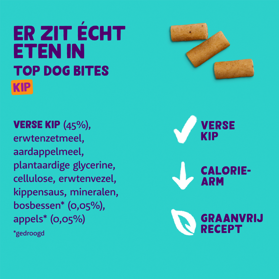 Ingrediënten: verse kip 45%, erwtenzetmeel, aardappelmeel, plantaardige glycerine, cellulose, erwtenvezel, kippensaus, mineralen, bosbessen (gedroogd) 0,05%, appels (gedroogd) 0,05%.