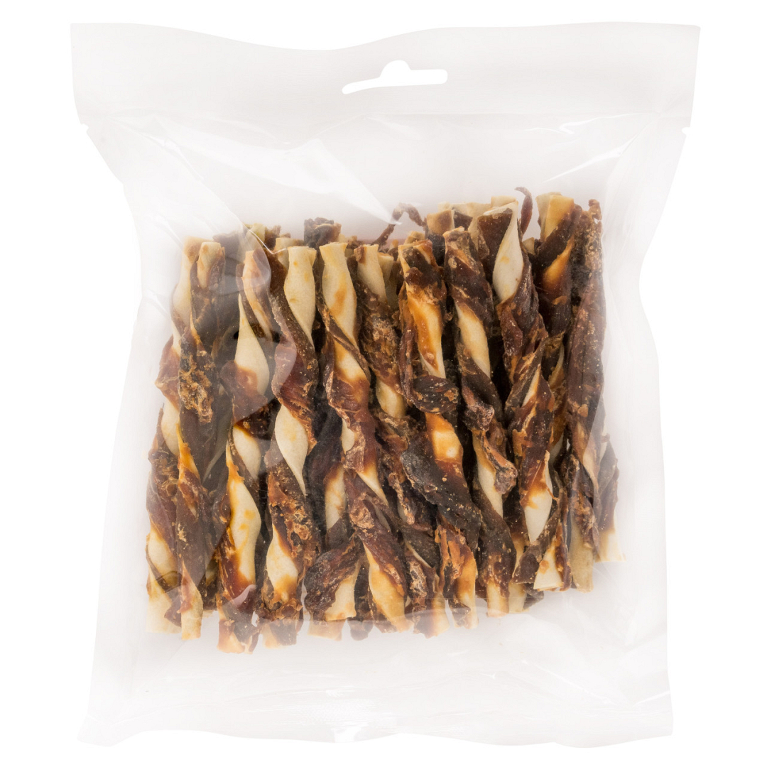Smakelijke en natuurlijke hondensnack van runder- en varkenshuid omwikkeld met kip. Glutenvrij.