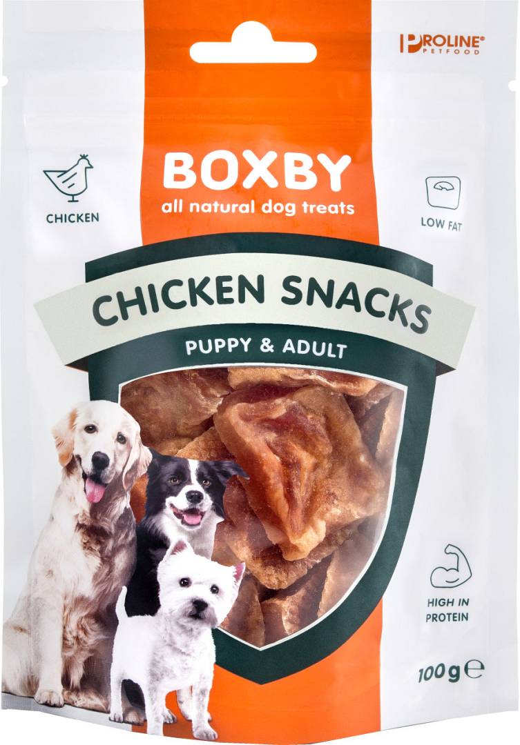 Proline Boxby Chicken Snacks zijn eiwitrijke snacks met een laag vetgehalte, 100% vlees van de kippenborst.