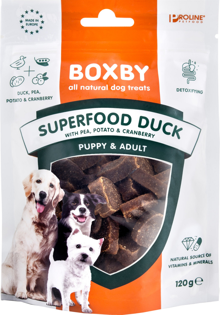 Proline Boxby Superfood Duck met erwt, aardappel en cranberry is een verantwoorde snack met een ontgiftende werking voor jouw hond.