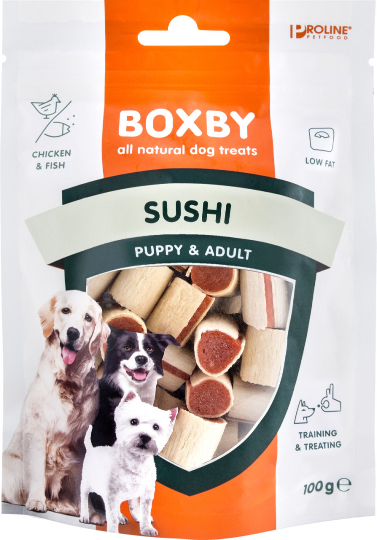 Proline Boxby Sushi heeft een laag vetgehalte, glutenvrij, sterke geur, gemaakt van vis en kip.