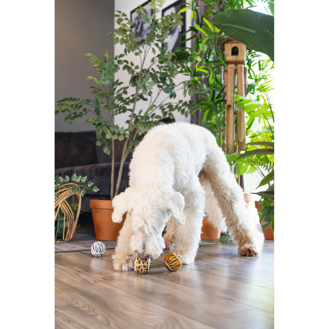 Drie tennisballetjes met een jungleprint. Om samen met jouw hond te spelen.