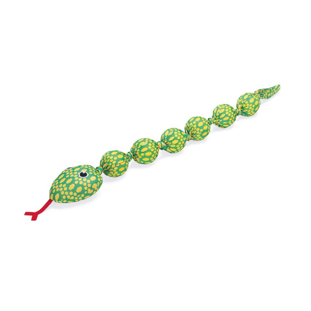 Hondenspeeltje in de vorm van een slang, waarin zes tennisballen verstopt zitten.
