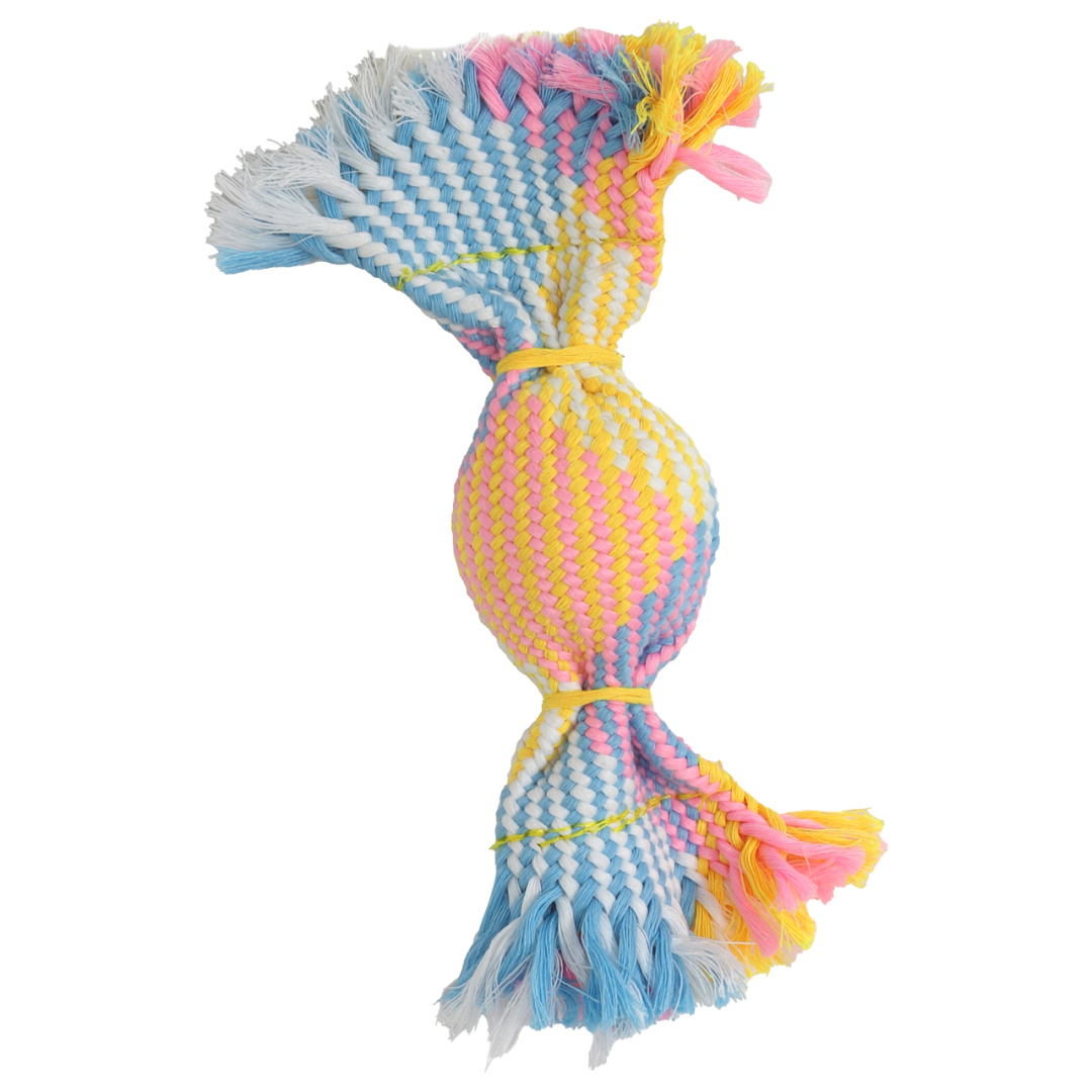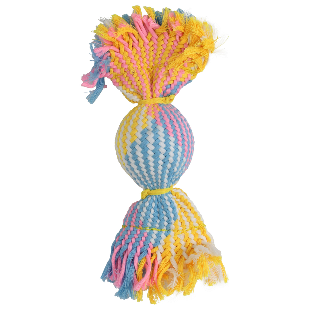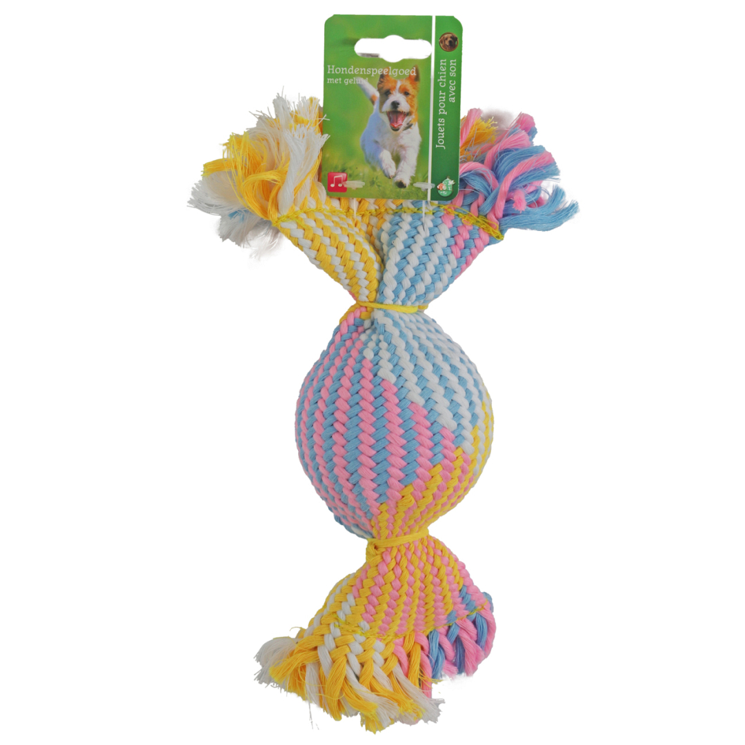 Maak elke speelsessie van jouw hond onvergeltelijk met dit kleurrijke hondenspeeltje toffee-bal met piep! Deze vrolijke bal omweven met polyester garen is niet alleen een feest voor het oog met zijn vrolijke multicolor design, maar ook voor de oren van jouw hond, dankzij het ingebouwde piepje. Perfect om te apporteren, kauwen of gewoon lekker mee te spelen.