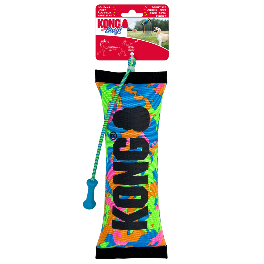 Het Kong hondenspeeltje Bunji High-Viz Bumper is ontworpen voor maximale zichtbaarheid met felle kleuren en contrasterende patronen, ideaal in elk terrein, weer of omgeving. Gemaakt van extra stevig brandweerslangmateriaal en afgewerkt met robuuste webbingranden, is dit speeltje perfect voor energieke apporteersessies. De geïntegreerde bungee-touwconstructie en het ergonomische handvat zorgen voor moeiteloos werpen over lange afstanden, goed voor de hond én jouw schouder! De ingebouwde pieper stimuleert het natuurlijke jachtinstinct voor extra speelplezier. Gooi verder, speel langer en beleef samen meer plezier met Kong!