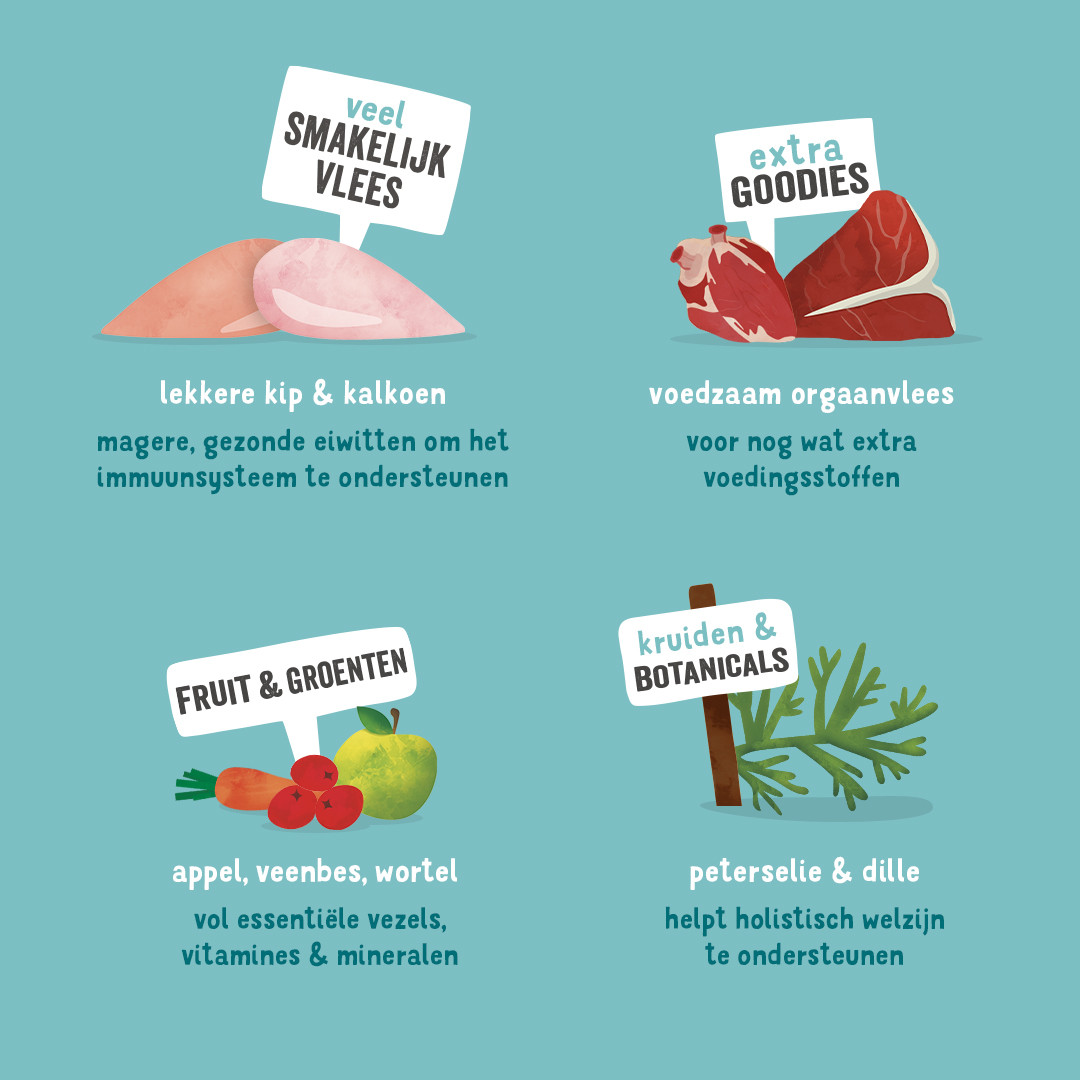 • Kip en kalkoen met proteïnes van hoge kwaliteit voor een gezond immuunsysteem en mager vlees lager in calorieën