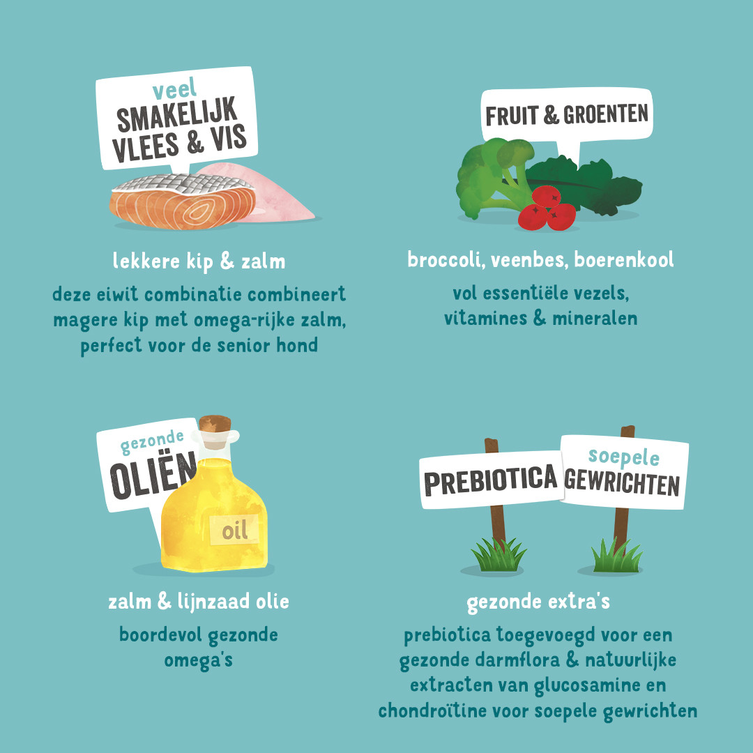 Graanvrij hondenvoer met kip en zalm voor oudere honden vanaf 8 jaar oud.