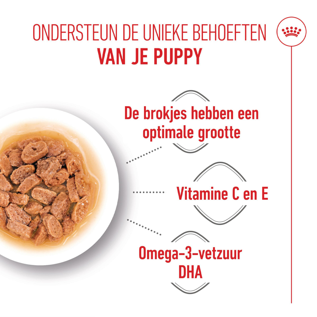 Royal Canin Mini Puppy Wet is natvoeding voor puppies van kleine honden tot 10 maanden met een volwassen gewicht van 1 tot 10 kilo.
