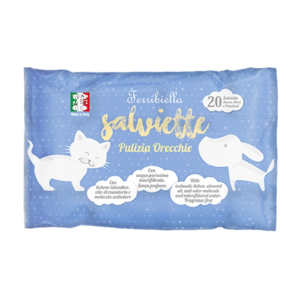 De Ferribiella Wet Wipes for Ears zijn gemaakt van zachte reliëfstof. De natte doekjes verwijderen vuil van de oren van je huisdier.
