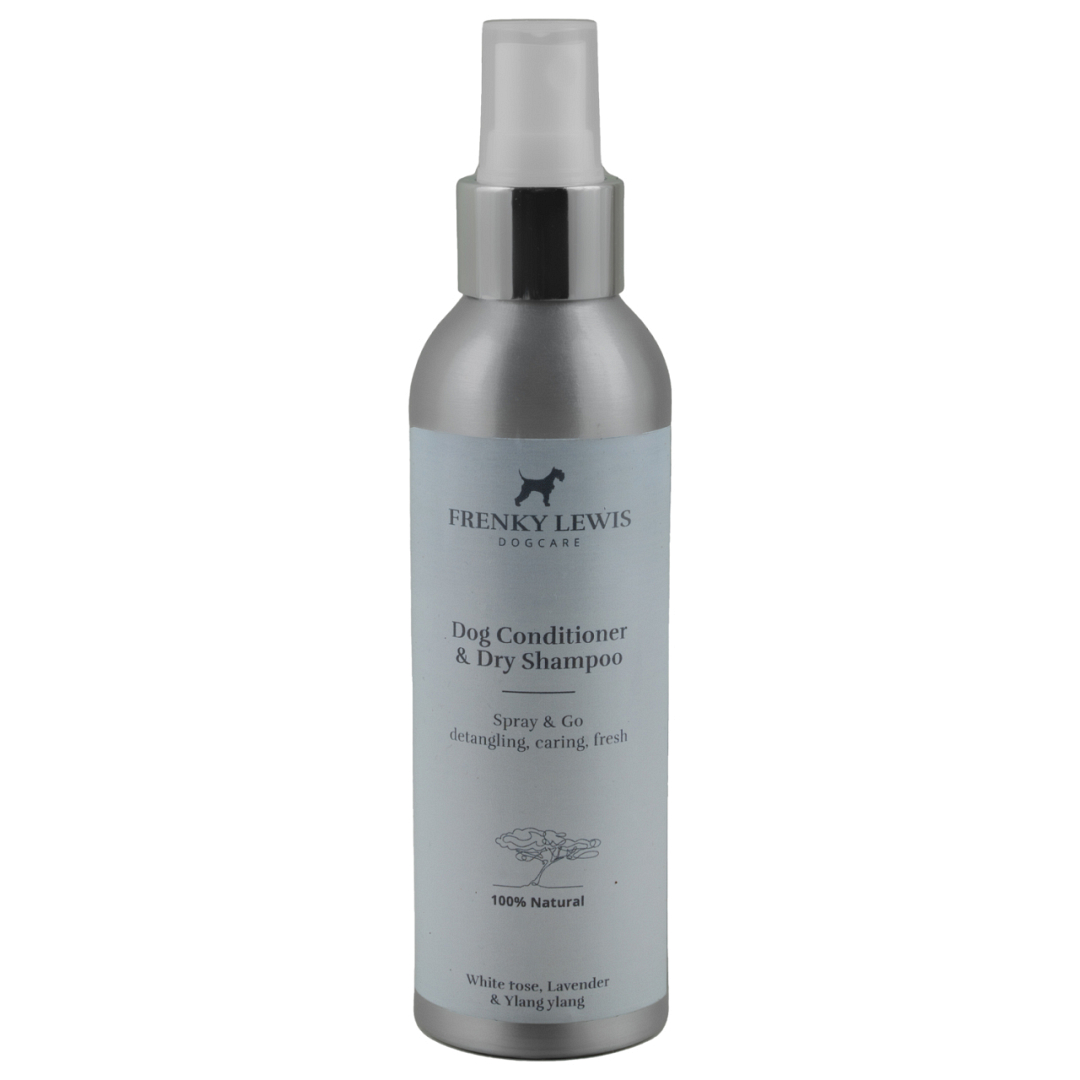 Natuurlijke ‘’spray and go” honden-droogshampoo & conditioner van Frenky Lewis. Ideaal voor honden die niet van douchen houden. Spray op de vacht en kam of masseer het in. Zo makkelijk is het! Bewaar de spray in je auto, zodat je jouw hond kan insprayen na zijn avonturen in het bos. De spray reinigt & verzorgt door de natuurlijke sopanine en ingredienten met antibacteriële werking.