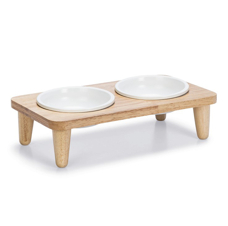 Dinerset gemaakt van rubberhout. Met twee vaatwasbestendige keramieken bakjes voor voer en water. Geschikt voor katten en kleine honden.