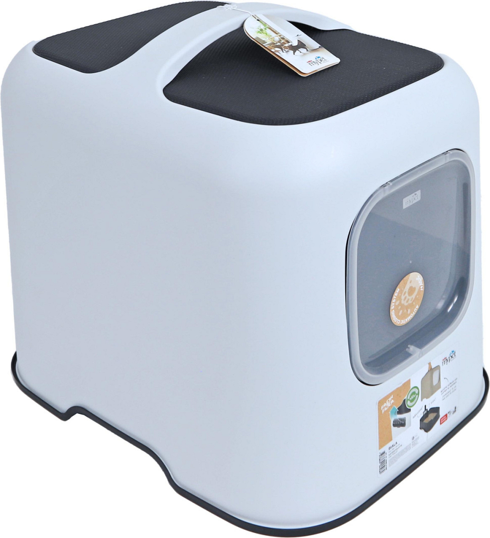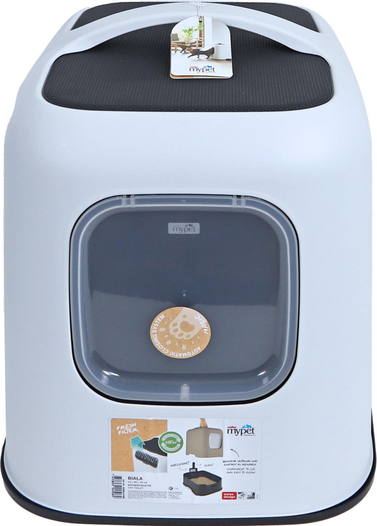 De Rotho Mypet kattenbak Biala is een stijlvolle kattenbak van gerecycled plastic en past goed in elk interieur, vanwege zijn moderne kleuren. Door de makkelijk afneembare bovenkap met handvat is het toilet ook zeer gemakkelijk te verschonen; de kap kan met een simpele handbeweging worden afgenomen en worden teruggeplaatst en er hoeven dus geen klemmen te worden vast of los geklikt.
