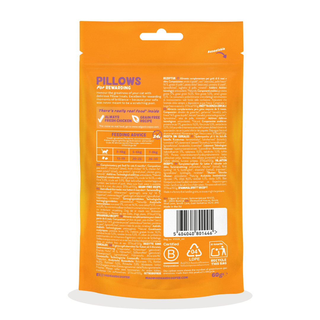 Edgard & Cooper Pillows zijn heerlijke kattensnacks met een zachte, rrromige vulling in een krokant jasje. Wedden dat je kat deze verrassende textuur onweerstaanbaar vindt? Boordevol lekker verse kip en natuurlijke ingrediënten, zonder granen of toegevoegde suiker. En met minder dan 2 kcal per snack mag je je kat gerust nog een keer belonen, en nog eens en nog eens.
