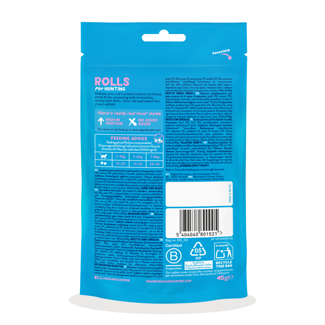 Edgard & Cooper Rolls zijn heerlijke kattensnacks met wel 86% zalm en kip. Ze zijn rijk aan eiwitten en leveren energie voor elke achtervolging. Gemaakt met natuurlijke ingrediënten, zonder granen of toegevoegde suiker.