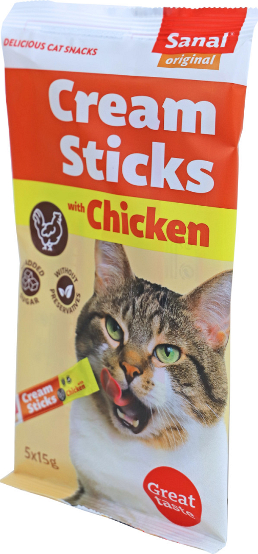 Sanal Creamsticks Kip zijn vloeibare snacks met kipsmaak in een handige portieverpakkingen. De snacks bevatten geen suiker en conserveermiddelen. Ze zijn gemakkelijk te geven aan je kat door simpelweg het zakje uit te knijpen.