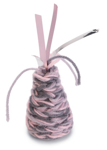 Wollen hoorntje met catnip en papieren lintjes voor extra speelplezier.
