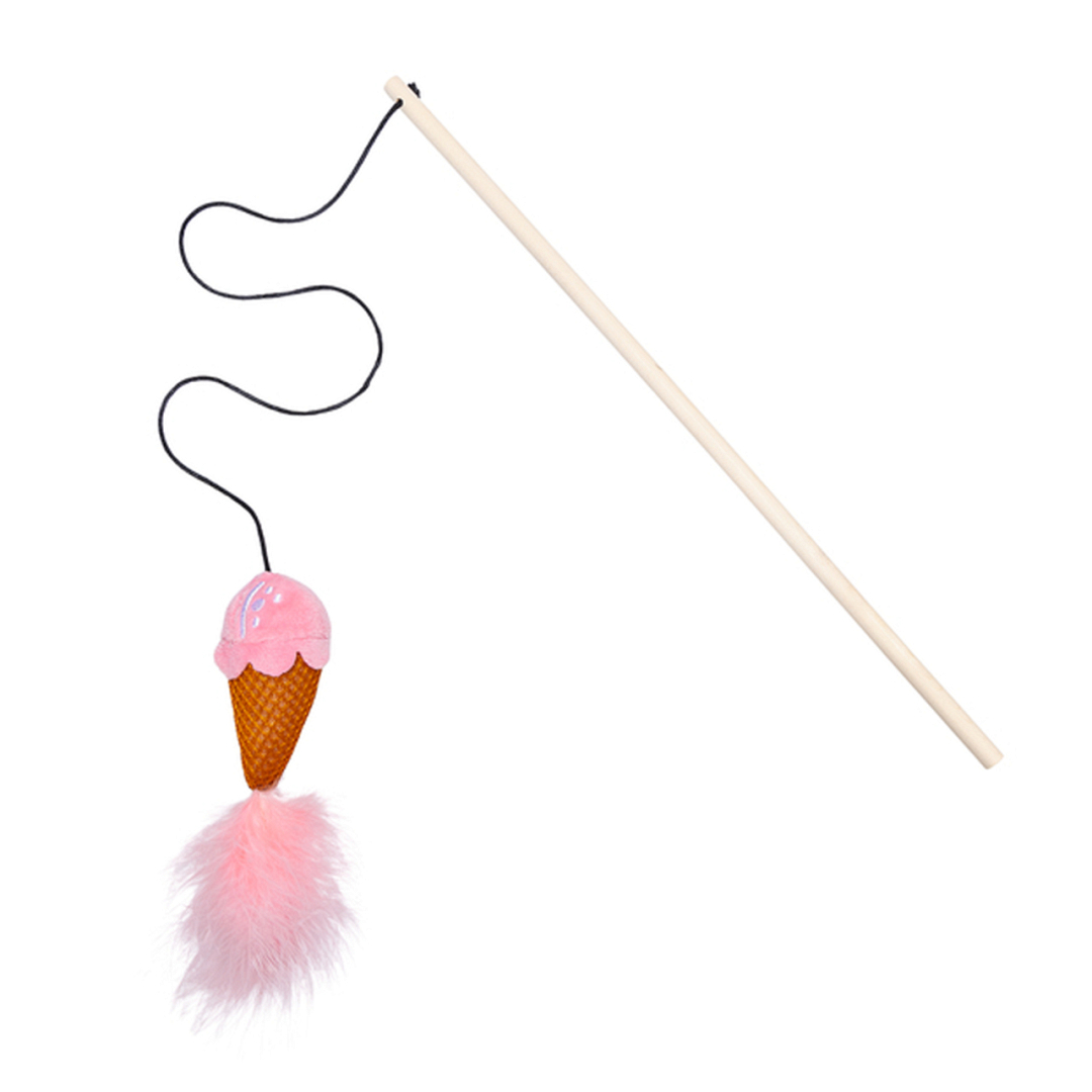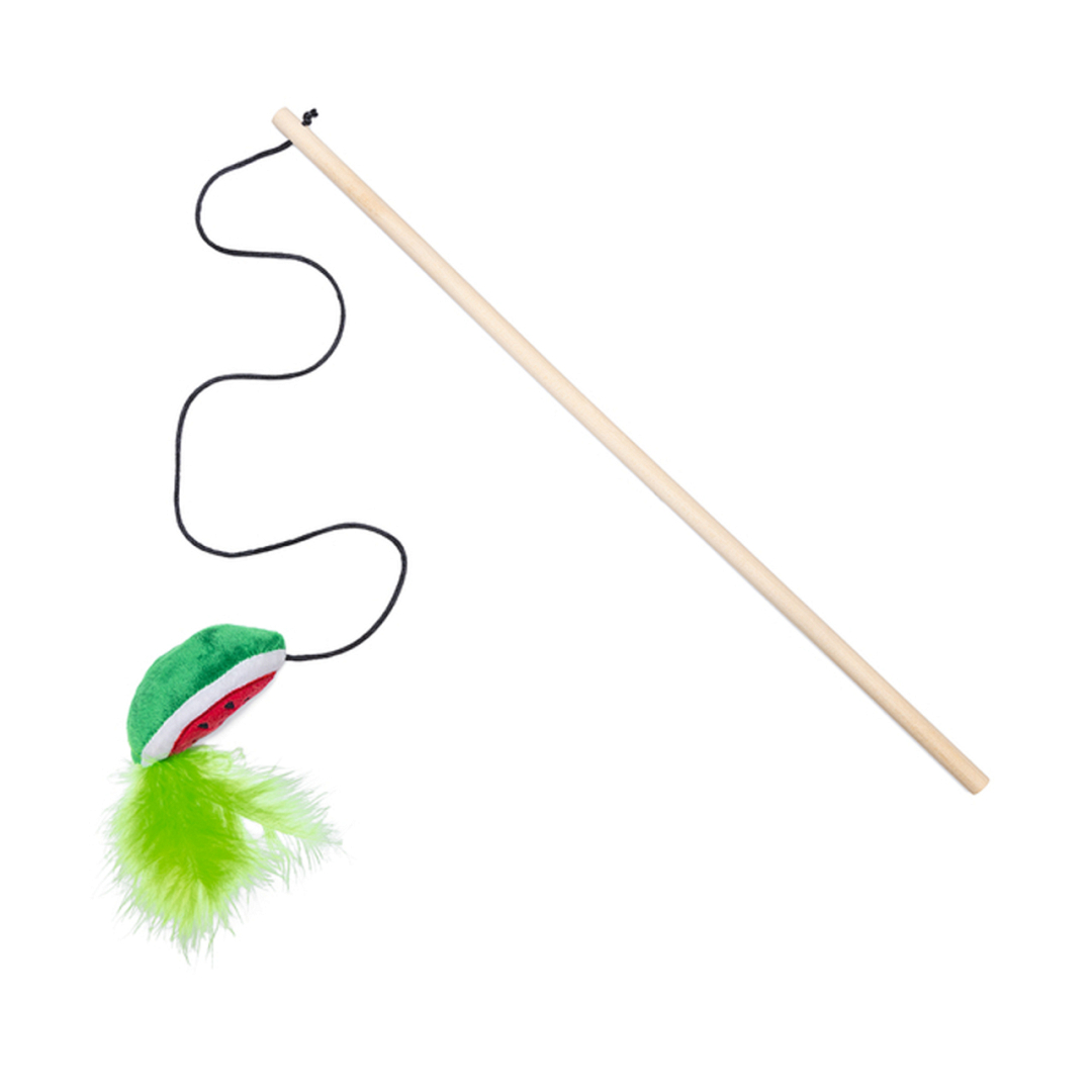 Houten kattenhengel met een zomers speeltje van pluche. Variant is niet vrij te kiezen.