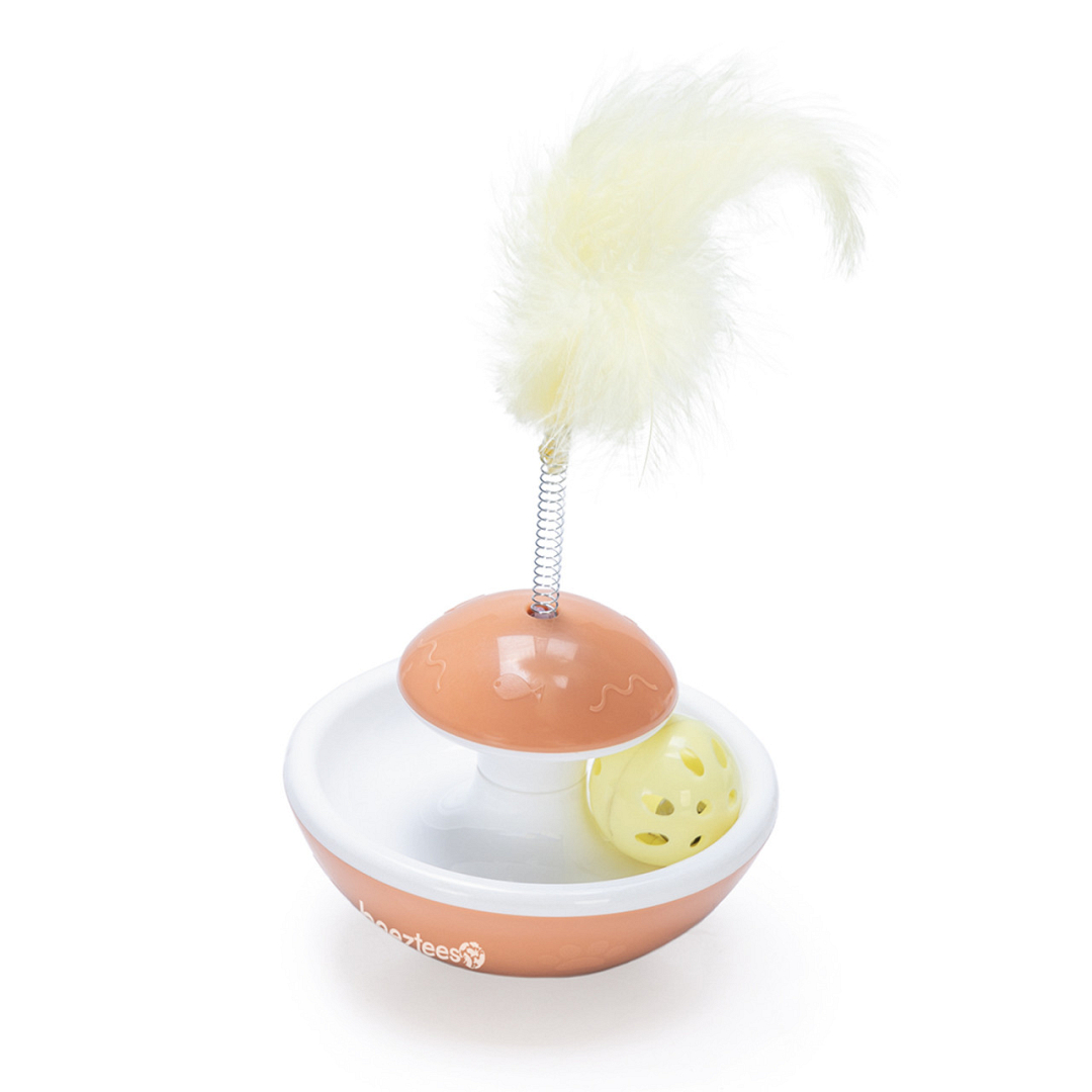 Met de Beeztees kitten tumbler Toeloes haal je interactief kattenspeelgoed in huis voor jouw kitten. Doordat jouw kitten tegen de veertjes slaat of het ronddraaiende balletje met belletje probeert te pakken, zal deze kattentuimelaar gaan bewegen. Door de bolling aan de onderzijde blijft dit leuke kattenspeelgoed heen en weer bewegen en de aandacht trekken van jouw kleine kattenvriend. Jouw kitten zal zichzelf hier eindeloos mee kunnen vermaken, dus ook ideaal als je hem of haar even alleen moet laten. Al met al beschikt dit Beeztees kittenspeeltje over allerlei leuke uitdagingen voor jouw kat, waardoor het jachtinstinct wordt gestimuleerd. De tumbler ziet er daarnaast vrolijk uit, met zijn terra roze accenten, visjes en pootjes motief. De speelspiraal met lichtgele veertjes zorgt voor extra speelplezier.