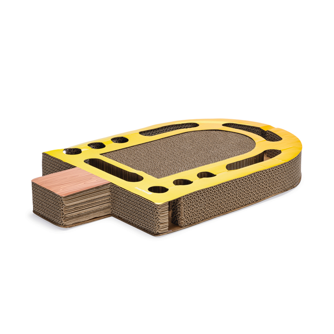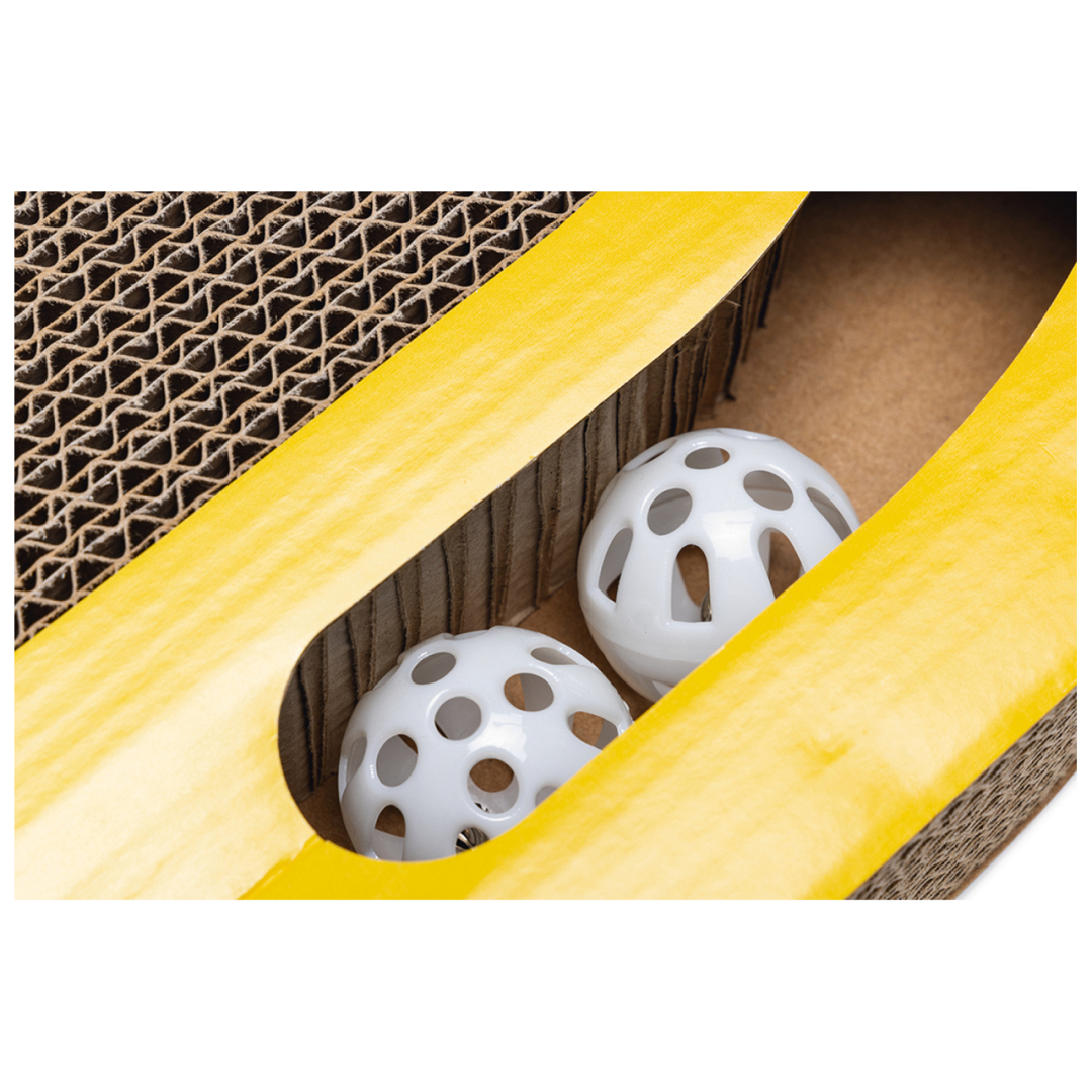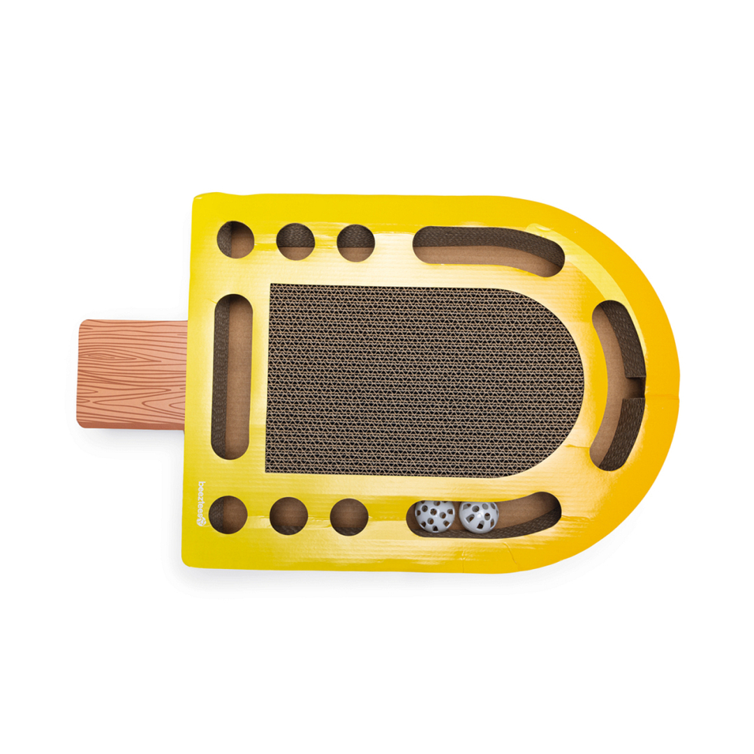 Zomers krabspeeltje van stevig karton. Met kattenkruid en balletjes voor extra speelplezier.