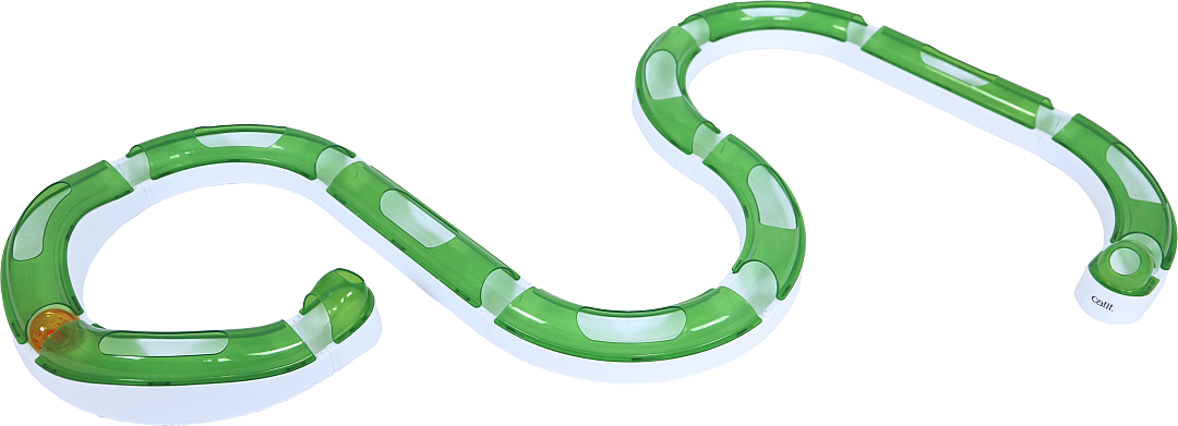 Deze groen/witte baan bestaat uit 10 tunneltjes met openingen (2x recht, 6x bocht en 2x verhoogde bocht), 2 uiteinden en een bal. De bal stimuleert de speelsheid en het jachtinstinct van jouw kat. De tunnels hebben openingen waardoor jouw kat het balletje kan zien. Wanneer jouw kat de bal door de baan duwt, gaat deze sneller door de wisselende hoogtes in het circuit. Het Super Circuit is makkelijk op te bouwen dankzij het zogenaamde klik-systeem en heeft een lengte van ± 250 cm.