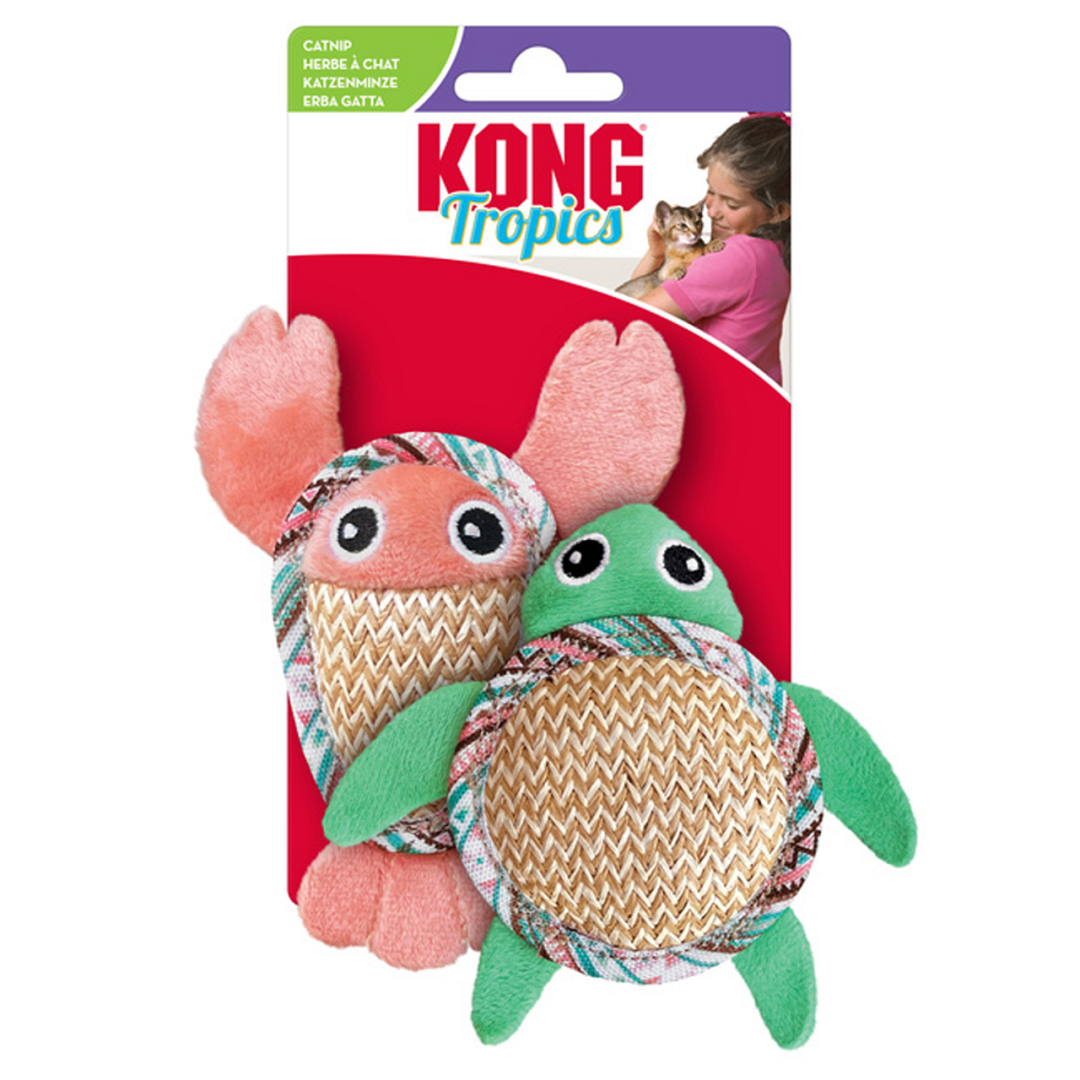 Kong Tropics Pals, tropisch speelplezier voor jouw kat! Deze kleurrijke zeediertjes zwemmen zo je kat tegemoet en blijven graag spelen! De krasbestendige herringbone buitenkant van tweedvezel is perfect voor kattentanden en -nagels, terwijl het zachte pluche uitnodigt tot knuffelen en kopjes geven. Met een vleugje Kongpremium North American catnip en knisperend materiaal prikkelen ze de zintuigen en stimuleren ze springen, slaan en jagen. Een veelzijdig speeltje dat jouw kat urenlang actief en blij houdt!