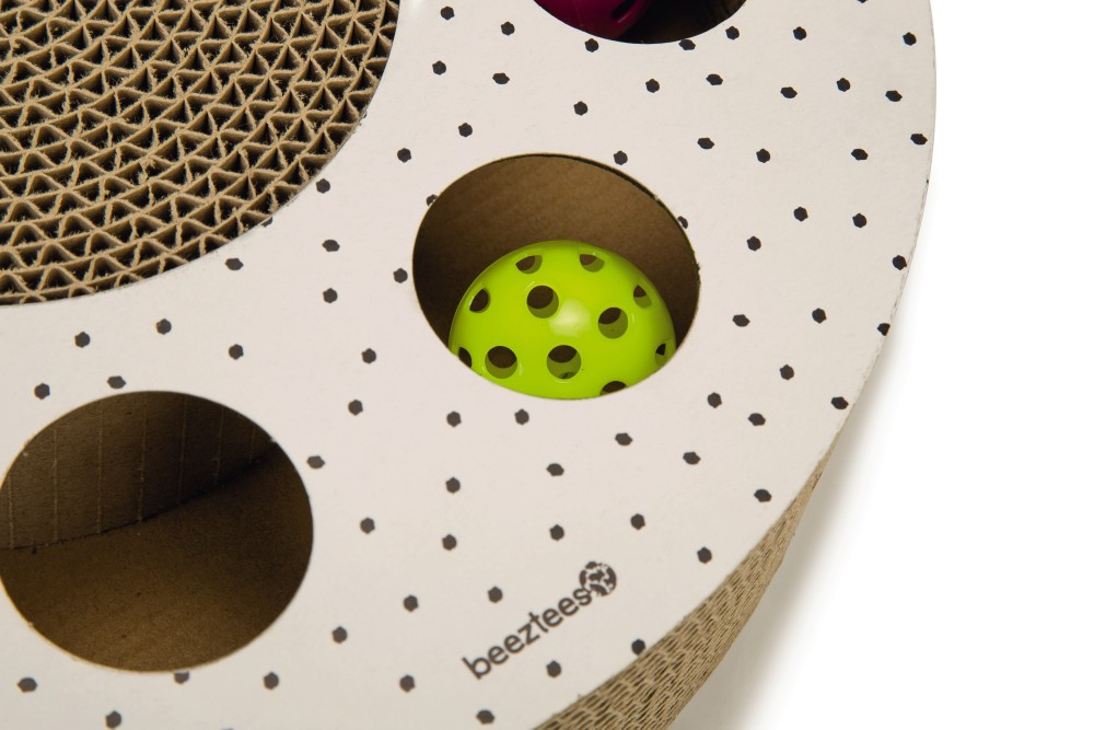 Krabspeelgoed van karton dat gebruikt kan worden om lekker te krabben. Daarnaast te gebruiken als spelletje om het balletje te pakken te krijgen. Afm.35 x 35 x 7 cm.