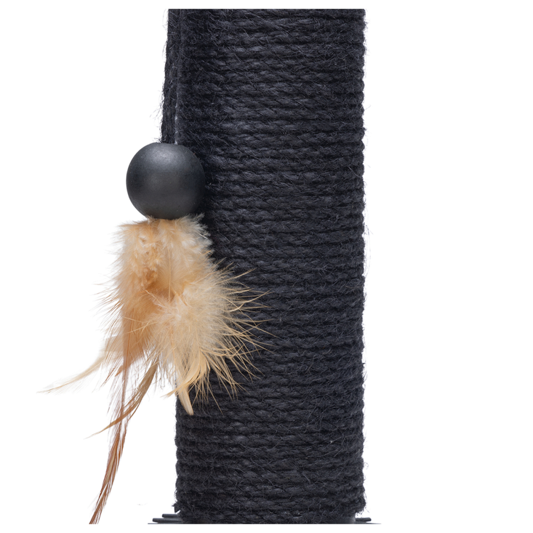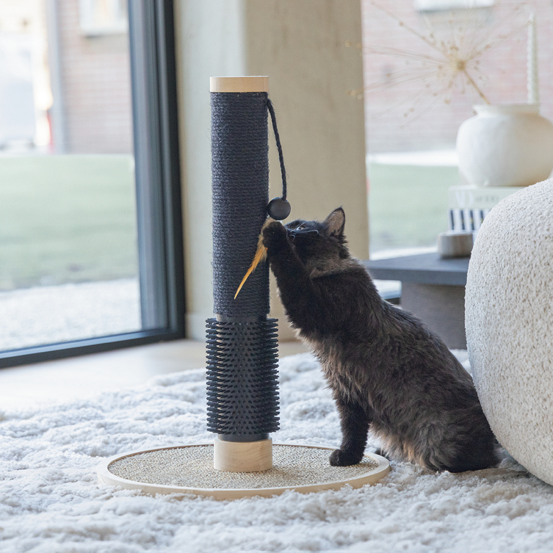 Laat jouw kat zijn of haar nagels en vacht verzorgen met de unieke Designed by Lotte krabpaal Fida. Deze stijlvolle krabpaal is gemaakt van rubberhout en heeft een stam omwikkeld met juten touw voor verticaal krabben. Krabt jouw kat ook graag horizontaal? Dan is de sisalmat op de bodemplaat perfect. Daarnaast kan jouw kat zijn of haar vacht verzorgen door kopjes te geven aan de borstel onderaan de krabpaal. De rubberen nopjes masseren de vacht, wat heerlijk aanvoelt. Uiteraard kan jouw kat ook spelen met deze krabpaal, want aan de stam is een touw met een balletje en veer bevestigd. Om je vloer te beschermen tegen krassen worden er stickers van vilt meegeleverd. Door de zwarte tinten en het lichte rubberhout zal deze krabpaal een pronkstuk zijn binnen jouw interieur.