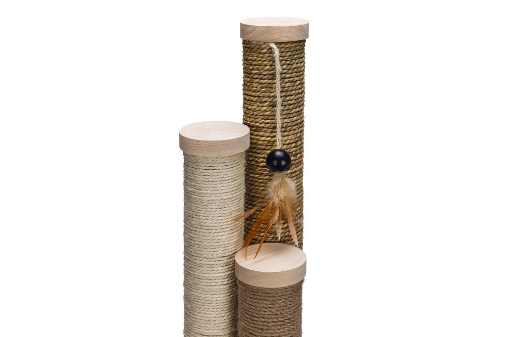 Krabpaal met drie stammen van jute, sisal en zeegras. Met rubberhouten voet met beschermingsdopjes. Geschikt voor katten tot 7 kg. Inclusief kattenspeeltje.