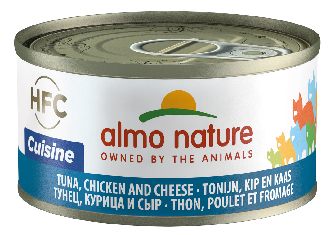 Almo Nature kattenvoer HFC Cuisine tonijn, kip en kaas is bereid met 100% HFC (Human Food Consumption) ingrediënten die van origine voor menselijke consumptie geschikt zijn. HFC Cuisine is er verschillende varianten welke bestaan uit meer dan de helft vis of vlees, kookbouillon en 1% rijst.