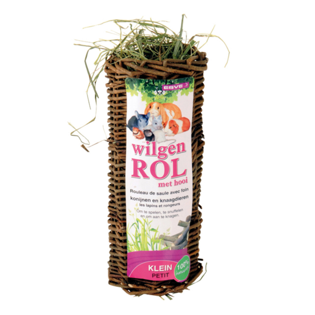 De rol is gemaakt van wilgenhout en gevuld met smakelijk hooi. Met de wilgenrol kan jouw huisdier knagen, snuffelen, knabbelen en spelen.