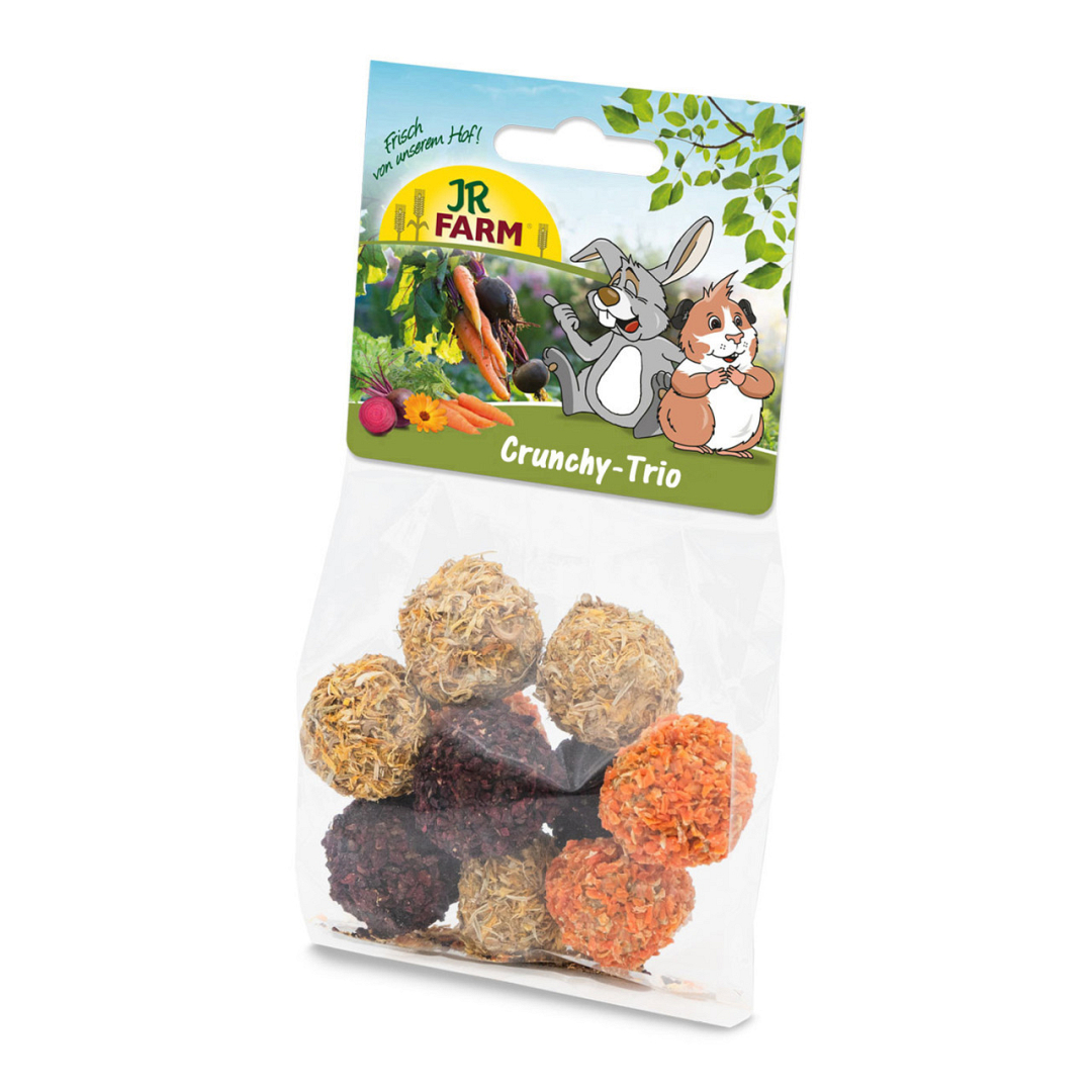 JR Farm Crunchy Trio zijn knapperige snackballen, in 3 verschillende vrolijke kleuren. Ze bieden jouw kleine knaagvriend een ideaal tussendoortje. Door toevoeging van allerlei natuurlijke ingrediënten zoals wortelen, maïs, luzerne en rode biet, geef je jouw knaagdier ook nog eens een zeer verantwoordelijke natuurlijke snack.