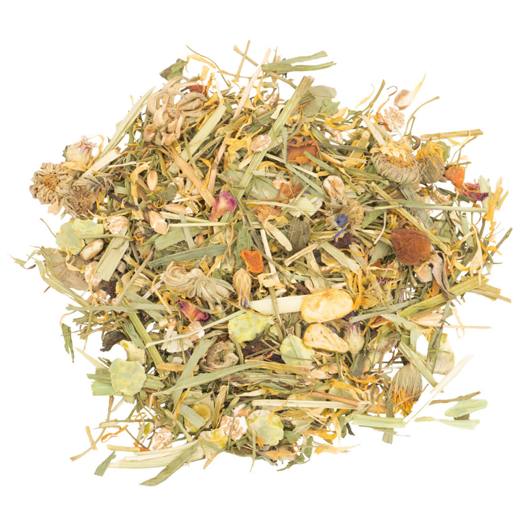 JR Farm Kruidenveld is een echte traktatie met knapperige vlokken van haver, tarwe en maïs voor een stevige basis, en bergweidehooi boordevol ruwe vezels ter ondersteuning van de spijsvertering. Peterselie, berkenblad en brandnetel werken vochtafdrijvend en helpen het lichaam zuiveren, terwijl paardenbloem en munt het metabolisme stimuleren en winderigheid tegengaan. De toevoeging van goudsbloemblaadjes kalmeert de huid van binnenuit, terwijl rozenblaadjes zorgen voor een subtiele geurbeleving. En met wortelstukjes vol beta-caroteen, ijzerrijke rode biet en erwtenvlokken boordevol plantaardige eiwitten draagt deze mix bij aan vitaliteit en welzijn van jouw kleine vriend. Een voedzame verwennerij voor elke dag!